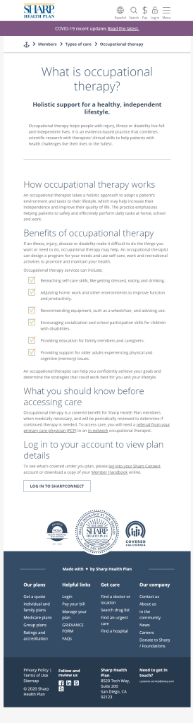 Sharp Health Plan is a local, not-for-profit health plan that serves both San Diego and Riverside county. They provide comprehensive health insurance for individuals and families, employers, and Medicare-eligible individuals. I was tasked with creating the copy for Sharp Health Plan’s occupational therapy landing page. Members expressed an interest in learning more about occupational therapy, so this page was created to bridge the gap between existing information in the Member Handbook and a landing page members could access quickly and easily.